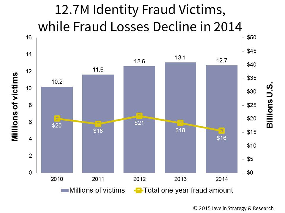 It appears from the Javelin Strategy & Research’s 2014 Identity Fraud report that although the number of identity theft victims was slightly lower than in 2013, that number was slightly higher than reported numbers for 2012. Fraud losses were also lower when compared to 2013 from $18 billion to $16 billion.